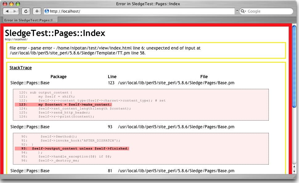 Catalyst, SubWay, Rails などのモダーンな Framework では、デバッグモードで Internal Server Error が起きるとスタックトレースなどをド派手な HTML で表示してデバッグを助けるような仕組みを持っています。で、Sledge::Plugin::DebugScreen なかなかド派手で気に入ったんですが、