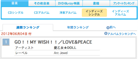 5/22 の発売日から一週間後の 5/29 付 HMV STORE 邦楽ランキングで第 3 位 (【参考】 1 位: 真夏の Sounds good! - AKB48, 2 位: アイシテラブル! - SKE48, 4 位: Face Down - 嵐) になったり、6/4 付オリコンインディーズシングル週間ランキング 1 位になるなど、じつは結構人気があります。↓↓↓