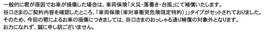 しかし、ダイレクト型自動車保険に加入した自分は「天災による被害は滅多には起こらないし起きても修理費はたかが知れてるものだから」と、補償範囲には含めずに掛け金の倹約を選んでいた。